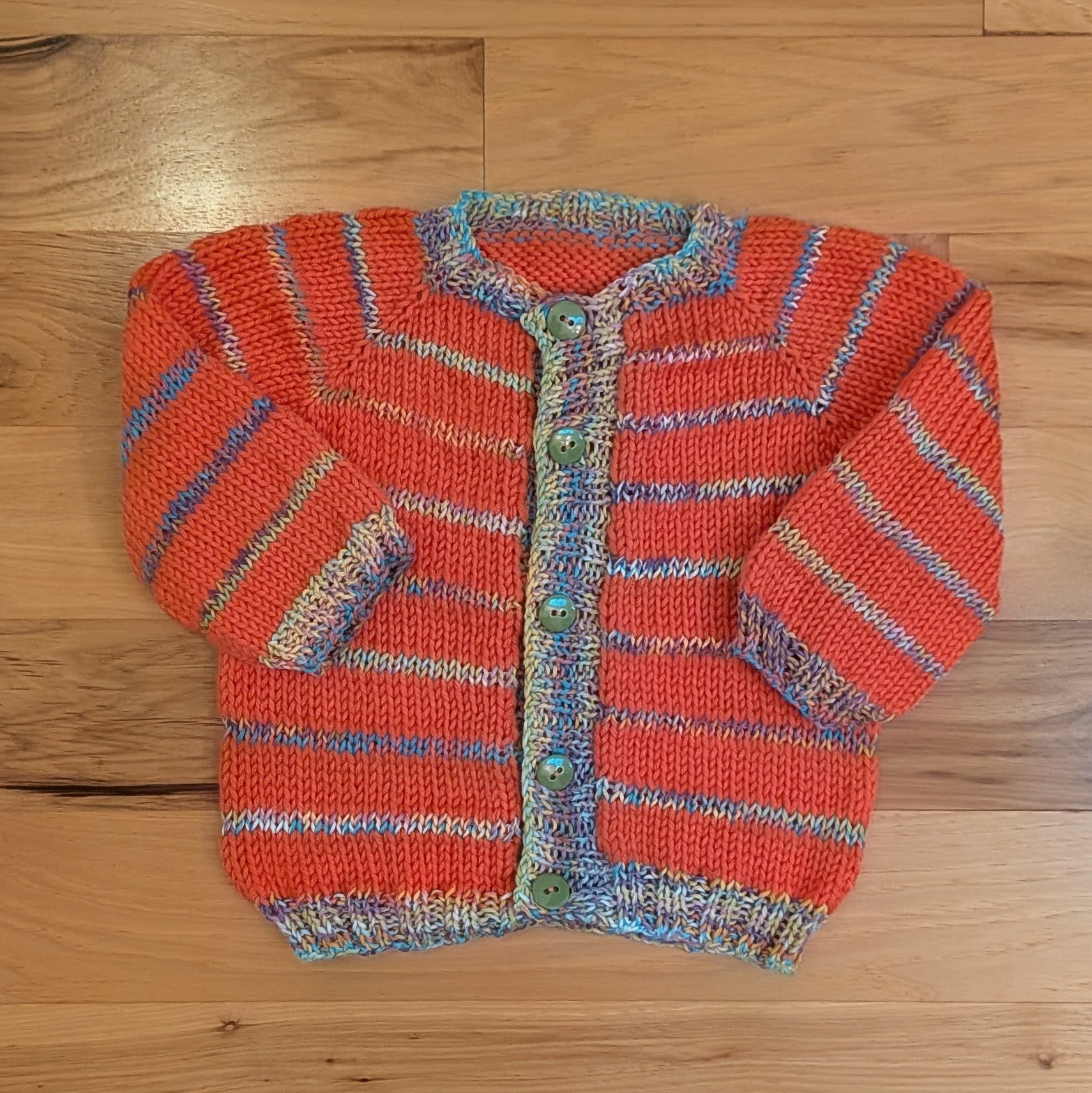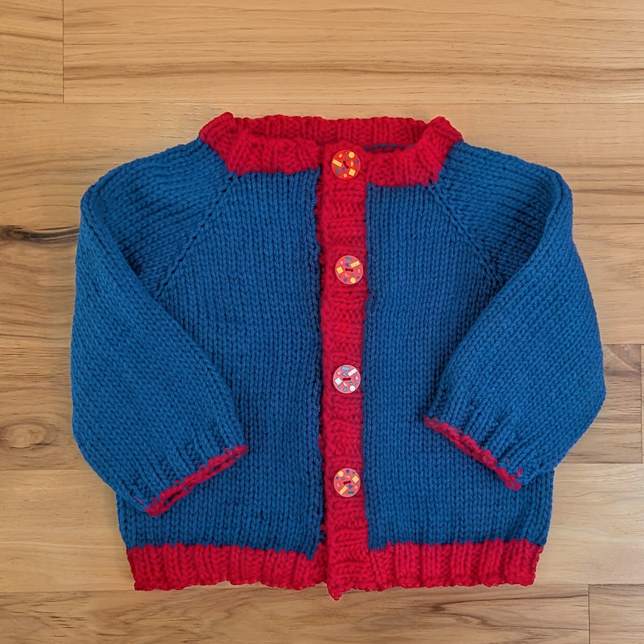 75/25 acrylic/cotton. Size to fit one year old. Machine wash cold water, gentle cycle. Lay flat to dry.